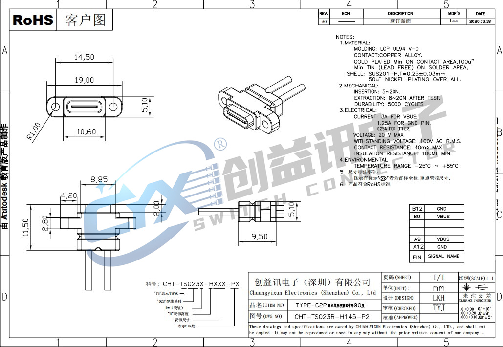 TYPE-C2P防水母座注塑带耳90度 CHT-TS023R-H145-P2